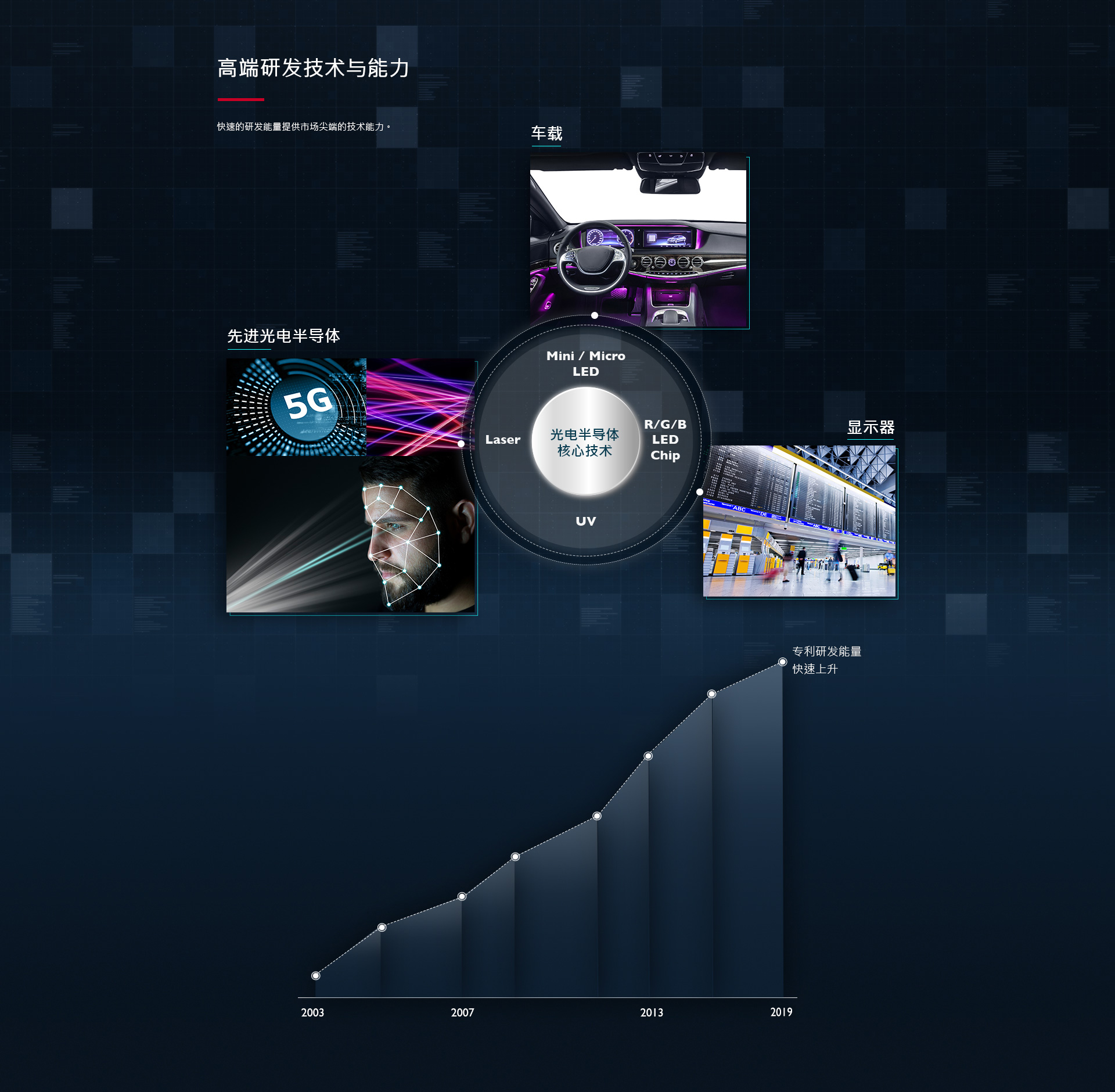 产品涵盖显示器背光源、Micro / Mini LED 光源,车用照明、3D / 2D 感测、UV 杀菌及固化、专业人因与特殊照明等,并广泛应用于家电、车载、工业应用等场域。